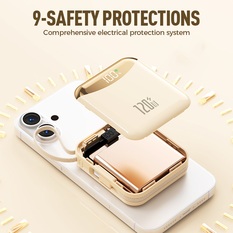 MULTI-LAYERED SAFETY PROTECTION SYSTEM – Featuring an advanced nine-point protection design encompassing overcurrent, overvoltage, overcharge, over-discharge, short-circuit and temperature control functions. The flame-retardant PC+ABS casing ensures worry-free safety throughout the entire 120W ultra-fast charging process, allowing you to power your devices with complete peace of mind.