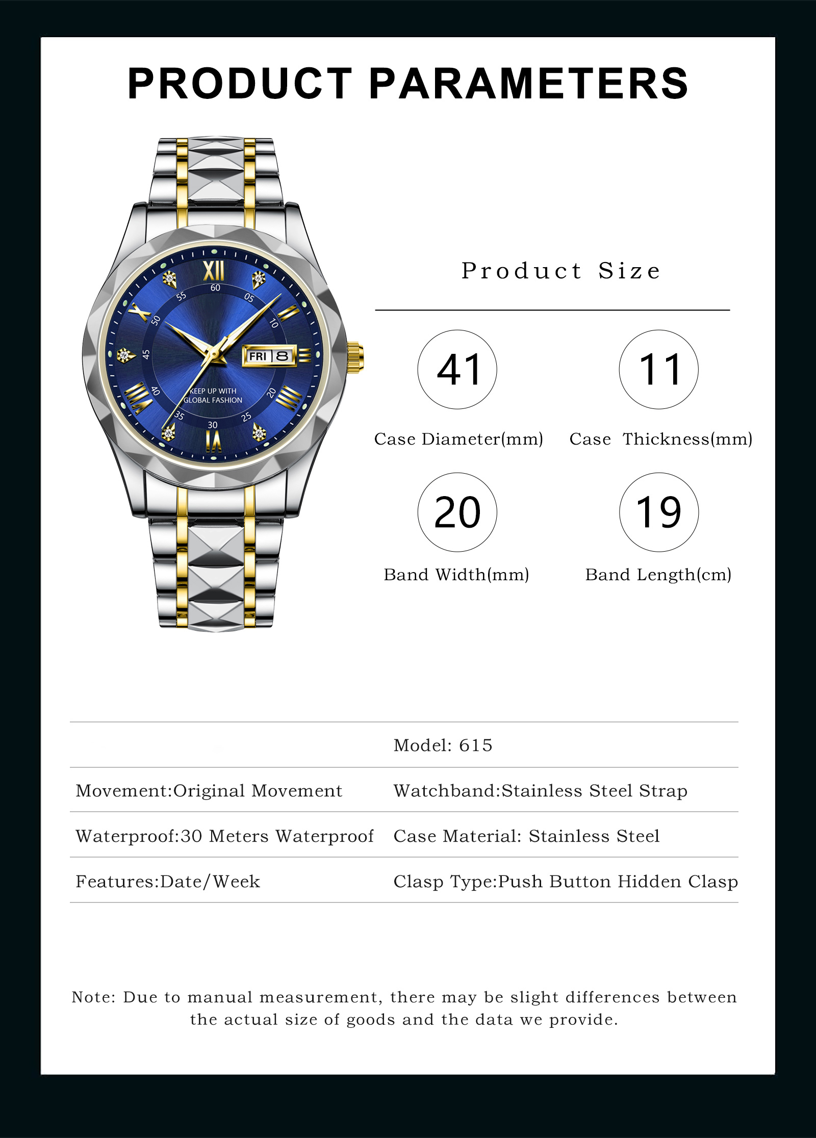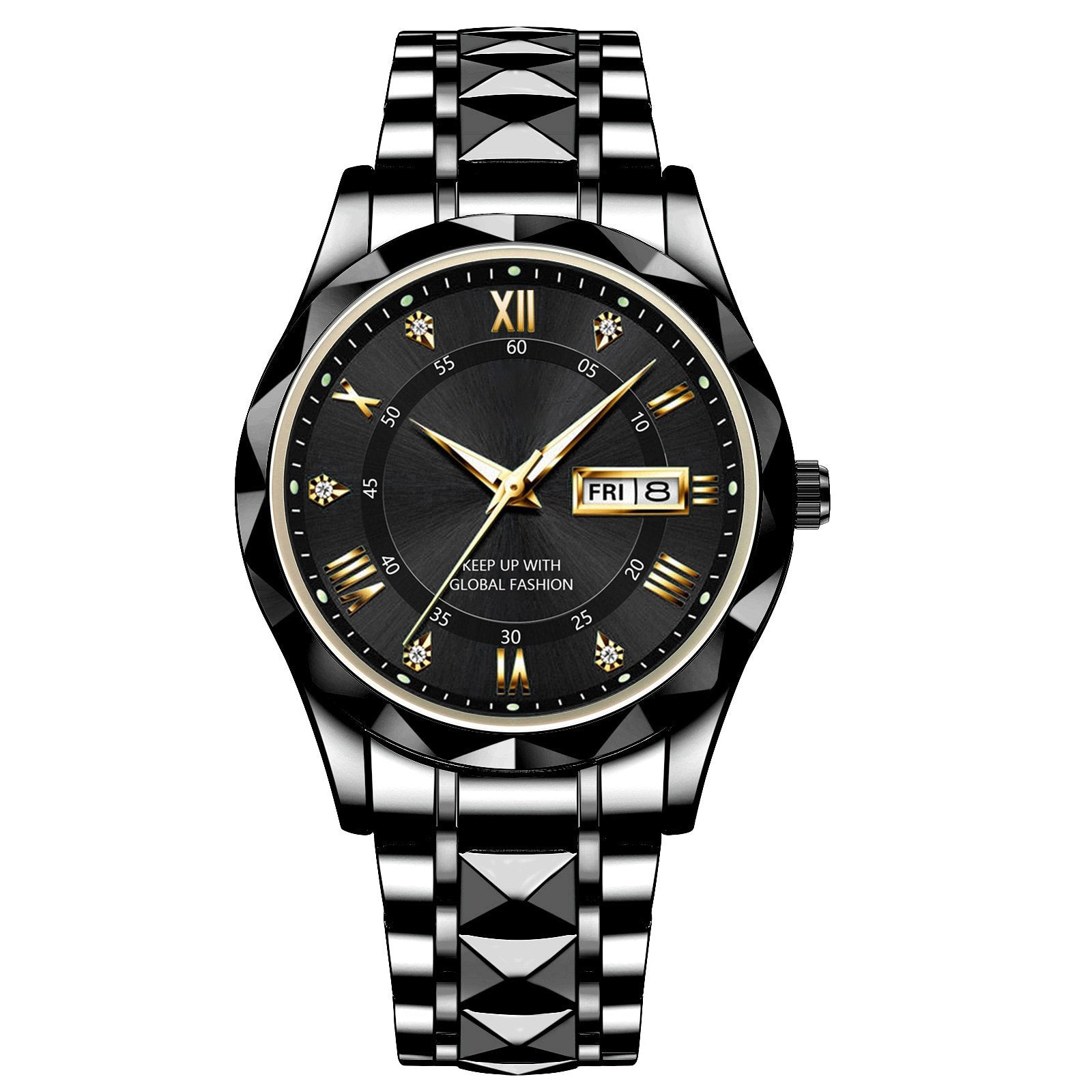 Classic Business Casual Dress Design ★ Stylish Golden bezel with neat firm diamonds, big face black dial with gold index (1.6"/40mm), fashion classic business style dress watches for men, Shiny hard wear-resistant adjustable Double butterfly clasp - Push Button Hidden Clasp, has been carefully designed to stand the test of time, So Handsome and Outstanding